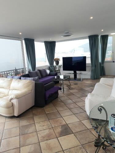 The apartment provides guests with a terrace, sea views, a seating area, satellite flat-screen TV, a fully equipped kitchen with an oven and a microwave, and a private bathroom with shower and a hair dryer. A toaster, a fridge and stovetop are also provided, as well as a coffee machine and a kettle. At the apartment complex, each unit is equipped with bed linen and towels.