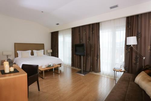 This room offers view of Kastoria’s lake and features wooden floor. Mattresses, duvets, pillows, bathrobes and towels are by COCO-MAT.