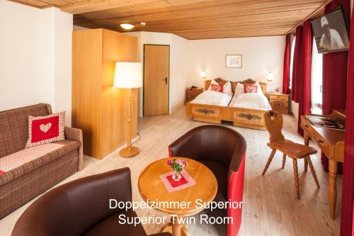 This room features oak wood furniture and a balcony with mountain views. It includes a seating area with a sofa, HD satellite TV, USB plug and safe. The private bathroom is fitted with a corner bathtub and a hairdryer.