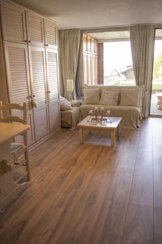 This studio offers a living room with a sofa bed for 2 people and 2 bunk beds. There is a bathroom and a kitchen. It is located on the 5th floor and offers panoramic views of the Alps from the balcony.